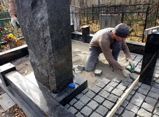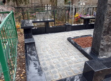 Далее мы приклеиваем лавочки и столешницу, в цветник засыпаем мульчу. Когда все работы на участке завершены – замываем брусчатку, тем самым смывая осевшую на памятнике и оградке бетонную пыль.